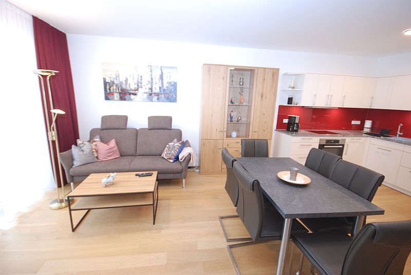 Im Wohnzimmer mit allergikerfreundlichem Parkettboden befindet sich eine Polstergruppe mit Wohnzimmertisch sowie eine gemütliche Esstischgruppe. Das Schlafzimmer, ebenfalls mit Parkettboden, ist mit einem Doppel-Boxspringbett mit Federkernmatratzen und automatisch verstellbaren Lattenrosten und mit einem geräumigen Schlafzimmerschrank ausgestattet.