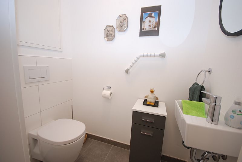 Das geräumige innenliegende Badezimmer verfügt über ein Waschbecken und eine Duschkabine. Das WC ist separat. Im Flur ist eine Abstellkammer vorhanden, in der eine Waschmaschine zur Verfügung steht.